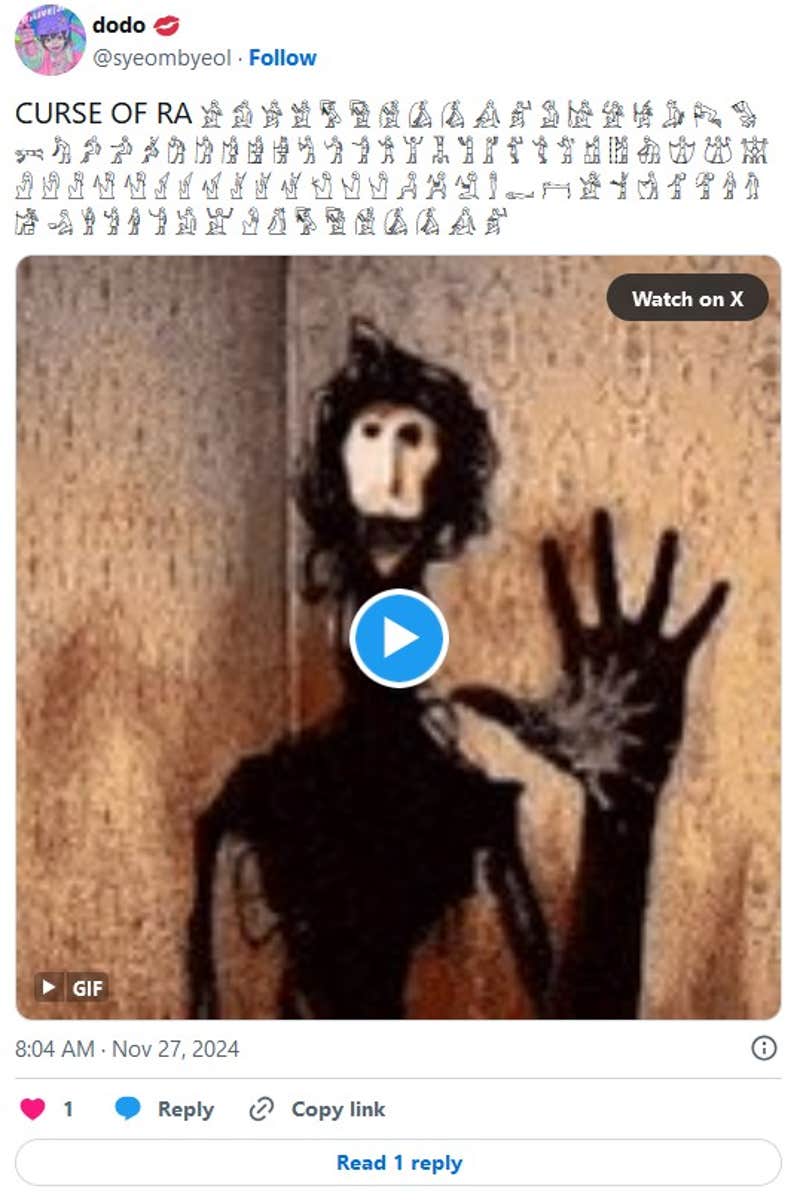 . CURSE OF RA ๐ ๐ ๐ ๐ ๐ ๐ ๐ ๐ ๐ ๐ ๐ ๐ ๐ ๐ ๐ ๐ ๐ ๐ ๐ ๐ ๐ ๐ ๐ ๐ ๐ ๐ ๐ ๐ ๐ ๐ ๐ ๐ ๐ ๐ก ๐ข ๐ฃ ๐ค ๐ฅ ๐ฆ ๐ง ๐จ ๐ฉ ๐ช ๐ซ ๐ฌ ๐ญ ๐ฎ ๐ฏ ๐ฐ ๐ฑ ๐ฒ ๐ณ ๐ด ๐ต ๐ถ ๐ท ๐ธ ๐น. Also known as the "Curse of Ra," memes about the Pharoah's Curse typically remixed videos of people trying to eat a spoonful of cinnamon as part of a viral 2012 internet trend called the.